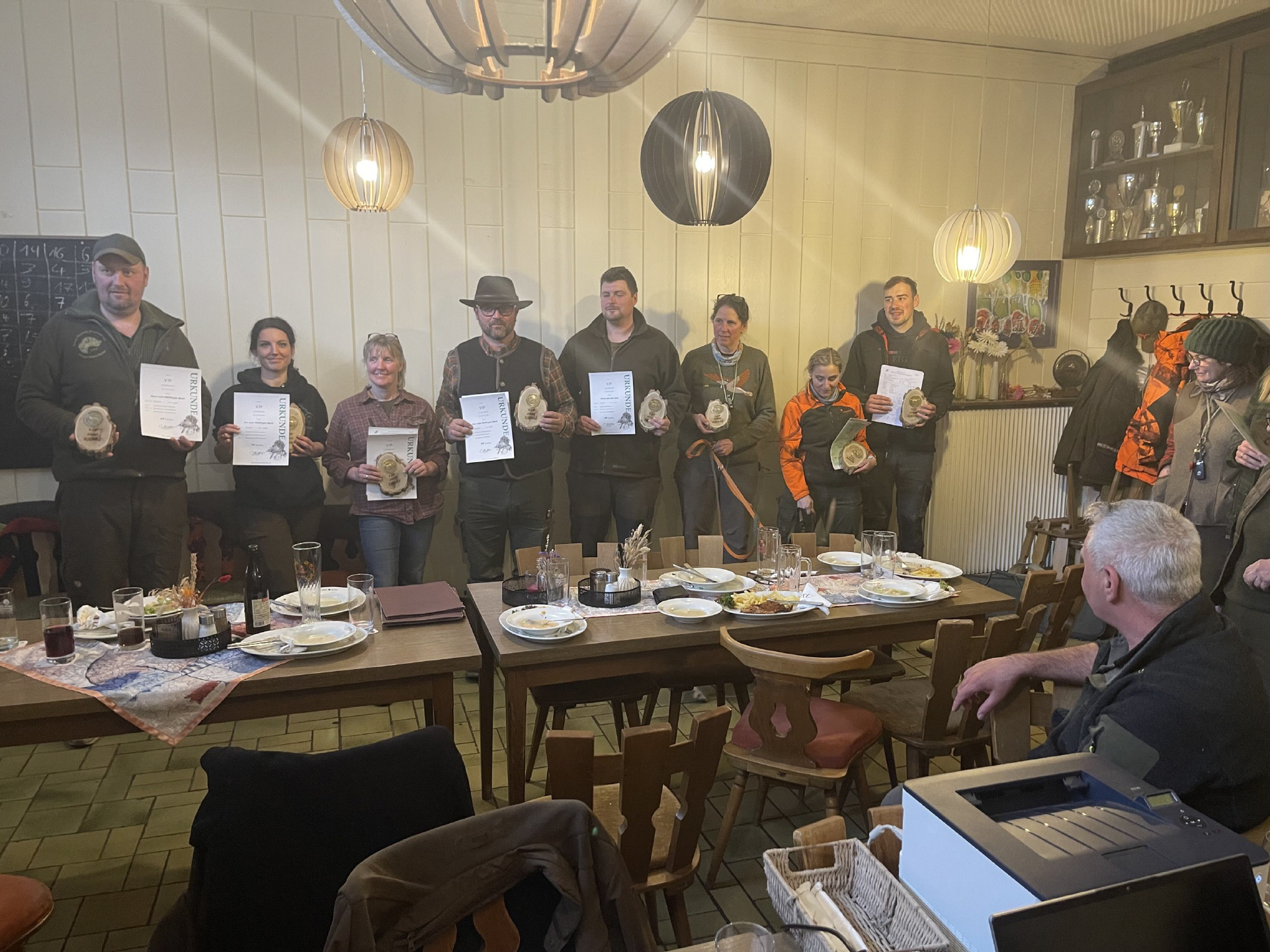 Gegen 13.30 Uhr hatten sich dann alle Beteiligten im Suchenlokal Gasthof Lutz in Giebelstadt eigetroffen. Der Suchensieg ging an den DD Rüden Ero vom Wülfinger Bach mit seiner Führerin Manuela Schief. Der zum Glück folgenlose Zusammenstoss der Hündin mit dem PKW ließ uns alle sich als Gewinner fühlen!
